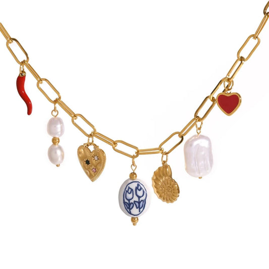 Les chaînes en acier inoxydable offrent durabilité. Les charms, assemblés à la main, combinent plaquage or 18 carats, nacre ou pierres naturelles (agate, quartz). Ces matériaux, avec des variations uniques, renforcent l'authenticité du bijou. Les ateliers garantissent un équilibre esthétique et une solidité optimale.